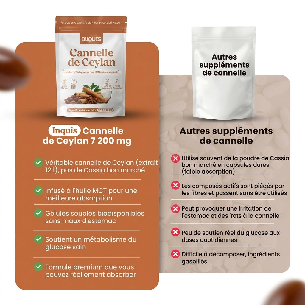 La plupart des produits classiques utilisent de la cannelle Cassia en poudre, enfermée dans des gélules difficiles à assimiler. Résultat : une formule souvent mal absorbée, moins agréable à prendre au quotidien, et peu convaincante sur la durée.