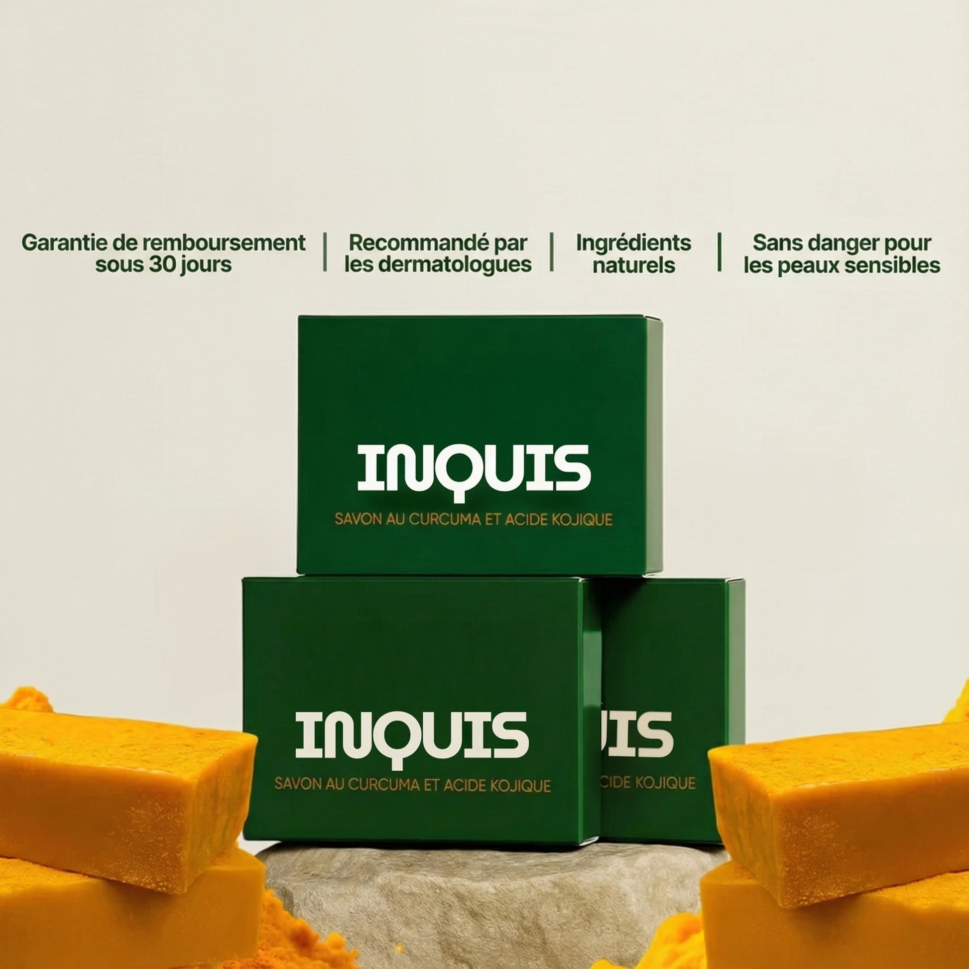 Nous sommes tellement convaincus que vous allez adorer le Savon Inquis au Curcuma et à l'Acide Kojique que nous vous offrons une garantie de 30 jours « Satisfait ou Remboursé ».